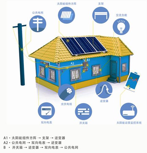 分布式光伏發(fā)電系統(tǒng),一般是建在工業(yè)廠房、商業(yè)建筑、農(nóng)業(yè)設(shè)施、市政公共建筑、民用建筑等滿足荷載要求的混凝土、彩鋼板和瓦片式屋頂以及邊遠(yuǎn)農(nóng)牧區(qū)、海島等少電無電地區(qū)。該類項(xiàng)目可以接入公共電網(wǎng),與公共電網(wǎng)一起為附近的用戶供電。分布式光伏發(fā)電遵循因地制宜、清潔高效、分散布局、就近利用的原則,充分利用當(dāng)?shù)靥柲苜Y源,替代和減少化石能源消費(fèi)。 戶用分布式光伏系統(tǒng)主要由光伏組件、支架、逆變器及監(jiān)控系統(tǒng)等組成,安裝在居民區(qū)屋頂,發(fā)電量自發(fā)自用、余電上網(wǎng)。
